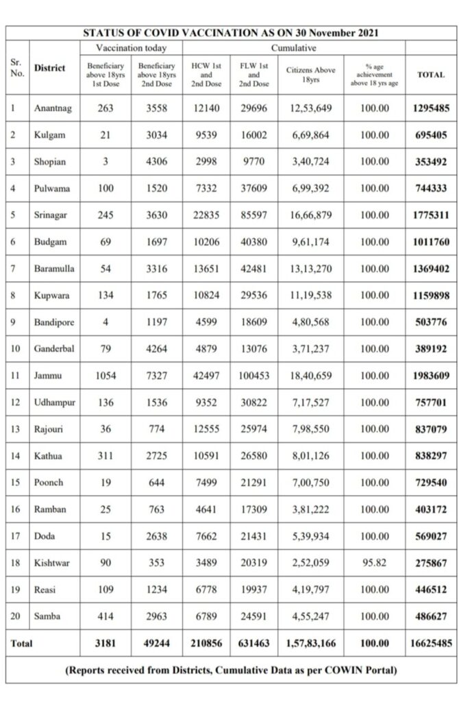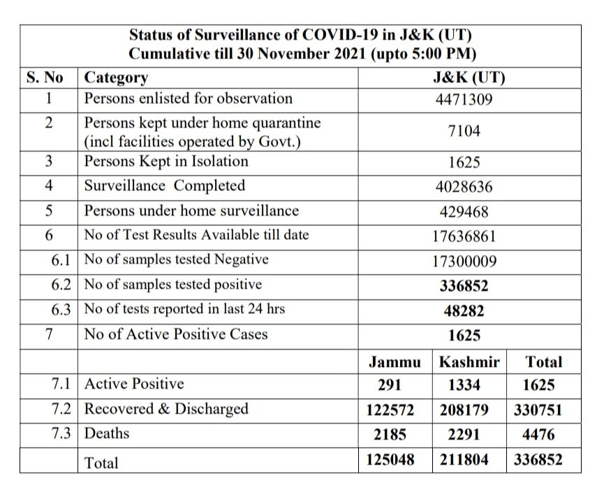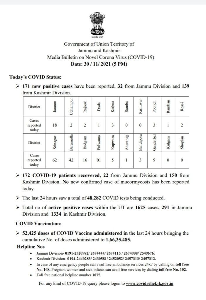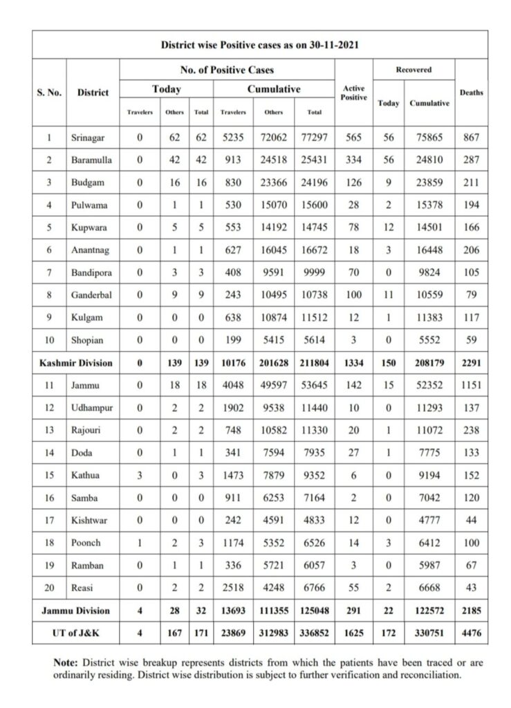 171 new positive cases reported; 32 from Jammu Division and 139 from Kashmir Division