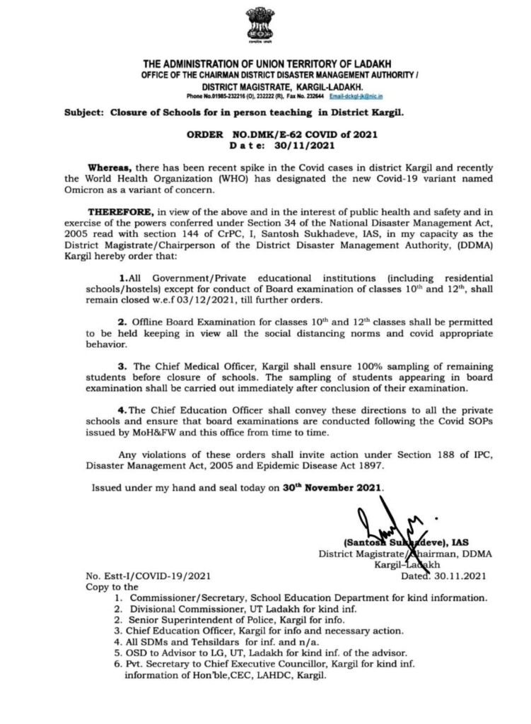 DM Kargil issues order for closure of schools for in person teaching in District Kargil from 3rd December, 2021 till further orders admin November 30, 2021 Image Gallery Ladakh Latest News Twitter