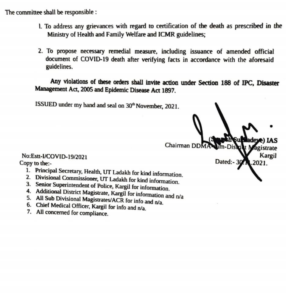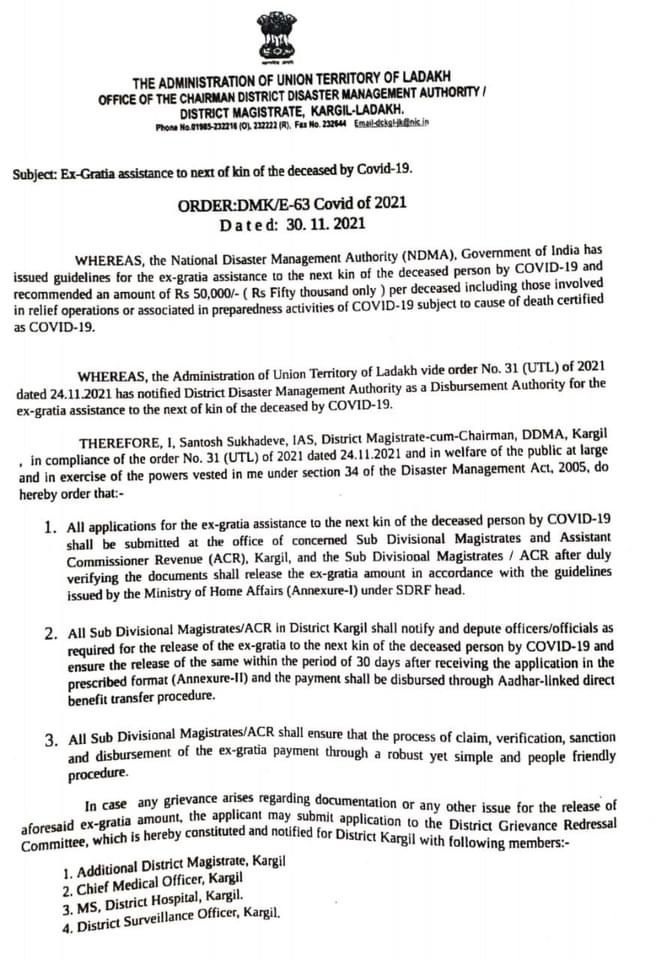 DM Kargil issues order regarding Ex-Gratia Assistance to next of kin of the deceased by COVID-19