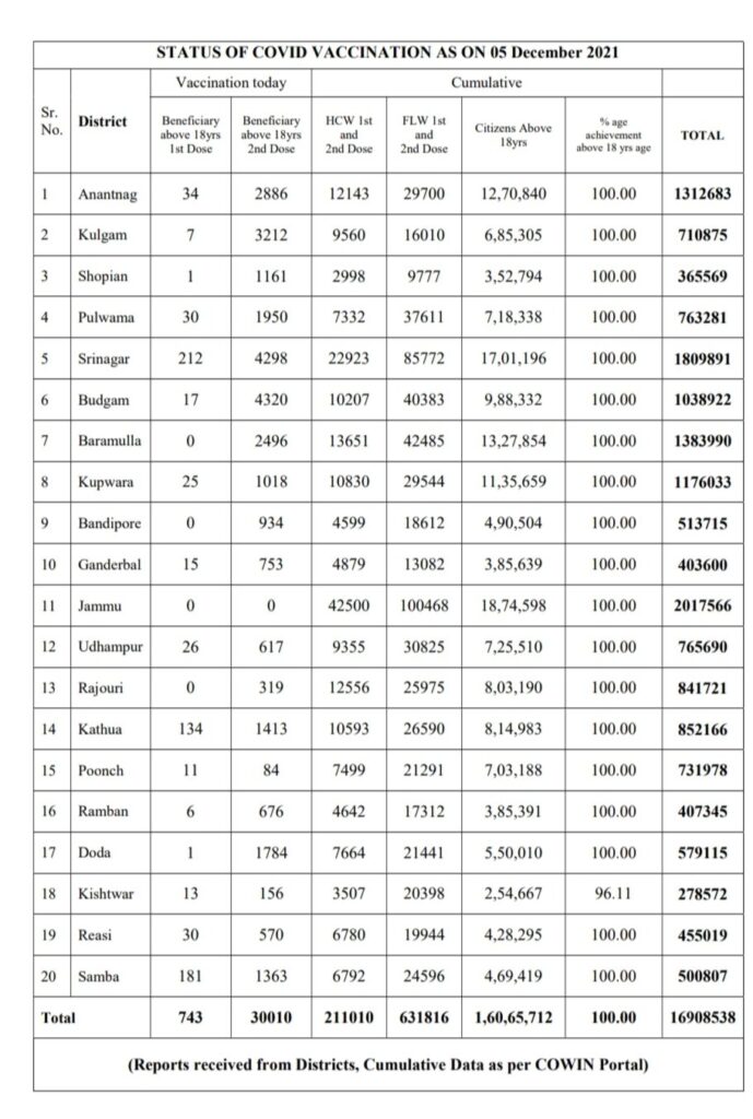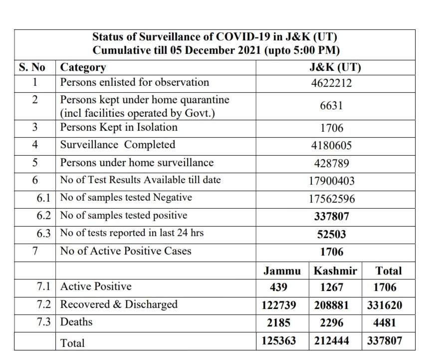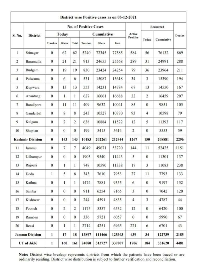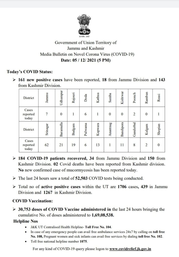 COVID-19 Bulletin December 05 admin December 5, 2021 161 new positive cases reported; 18 from Jammu Division and 143 from Kashmir Division Latest News Top J&K News