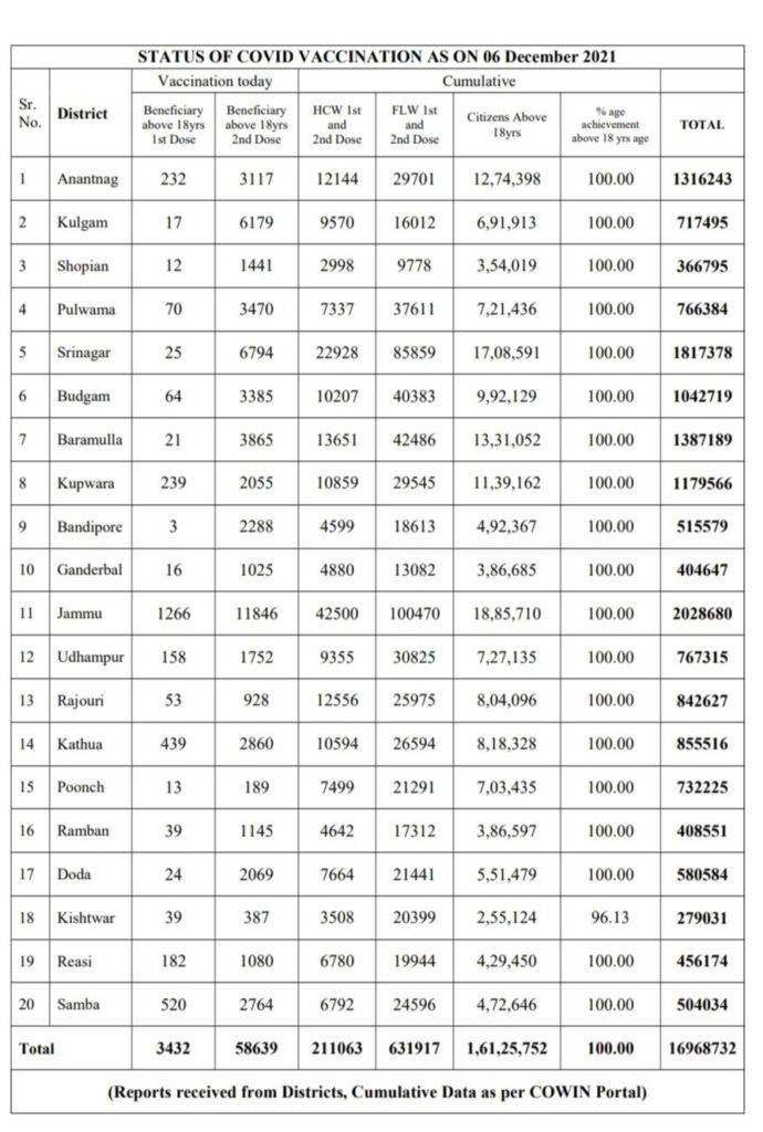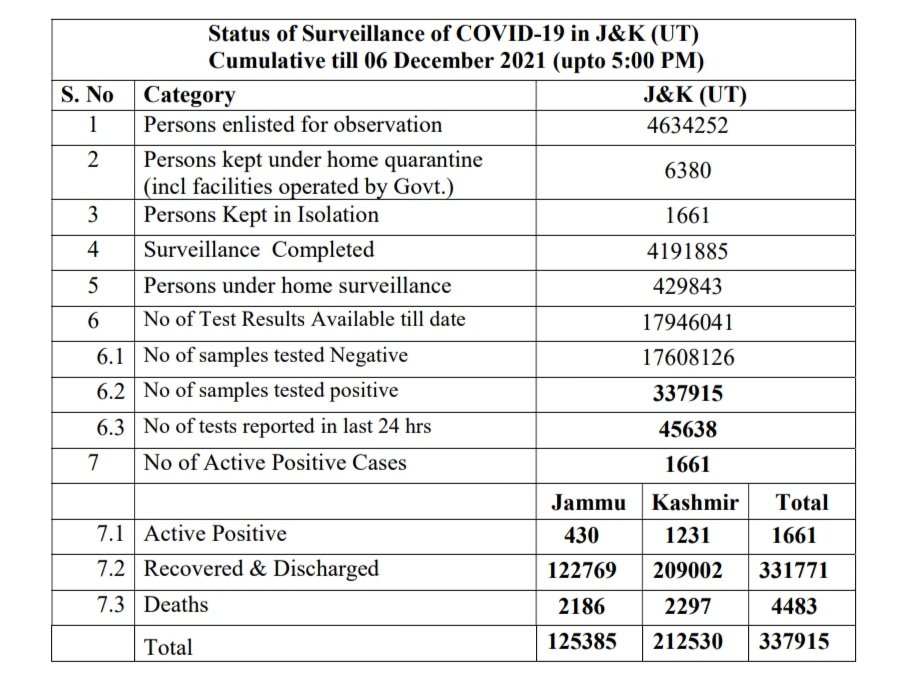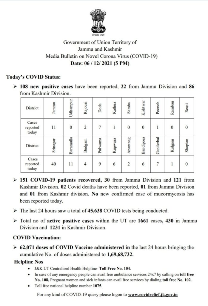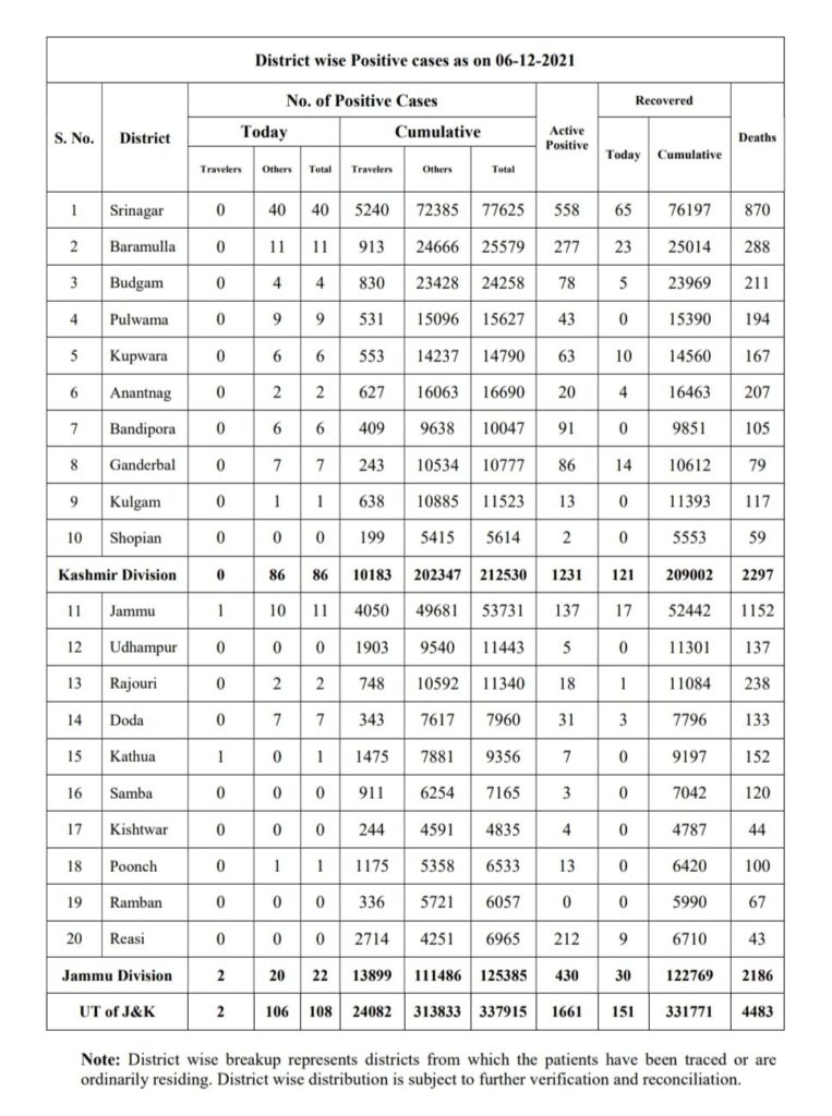108 new positive cases reported; 22 from Jammu Division and 86 from Kashmir Division; 02 Covid deaths have been reported, 01 from Jammu Division and 01 from Kashmir Division
