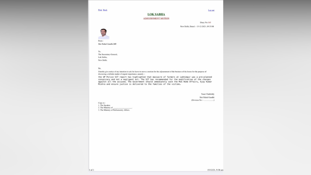 In his notice, Gandhi has sought for adjourning the business of the House and demanded that the Special Investigation Team’s (SIT) report on the Lakhimpur Kheri incident be taken up for discussion.