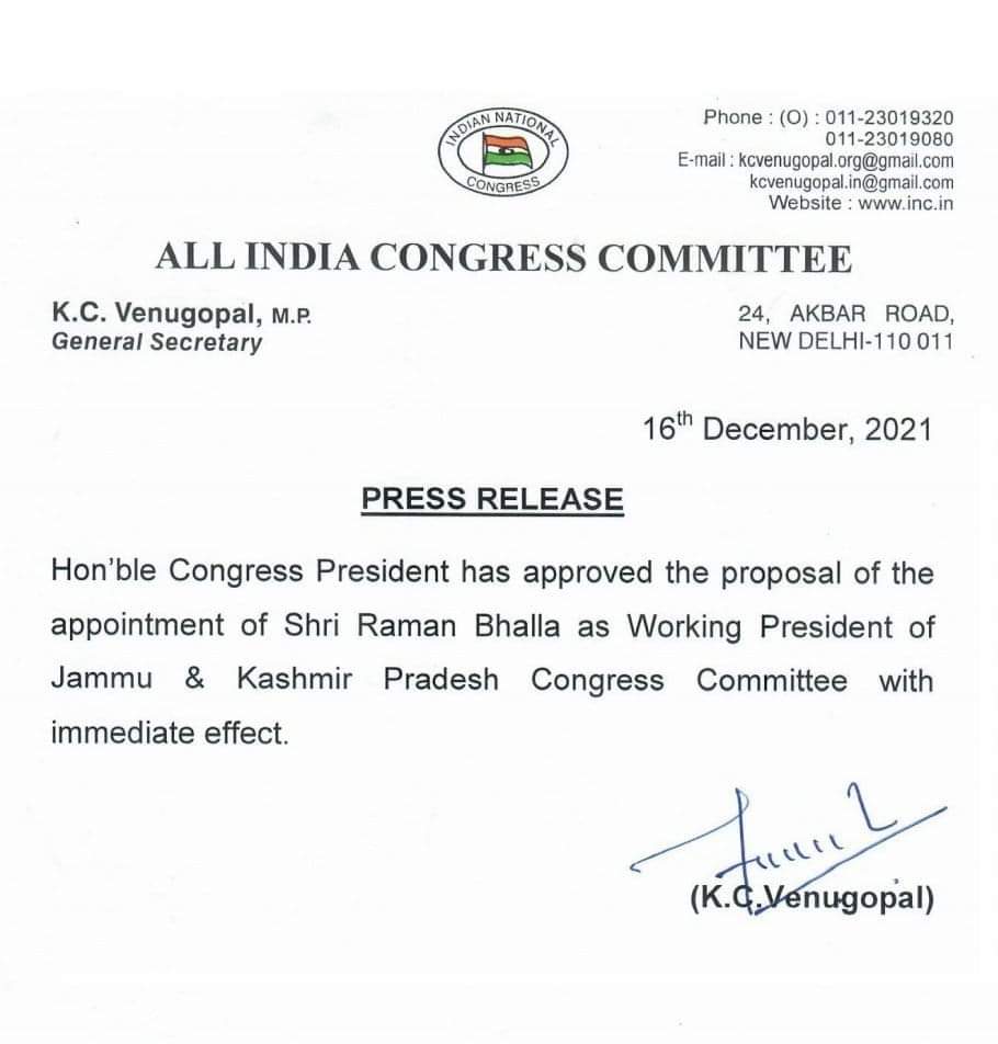 Former Minister & Senior Congress leader Raman Bhalla appointed as Working President of JKPCC