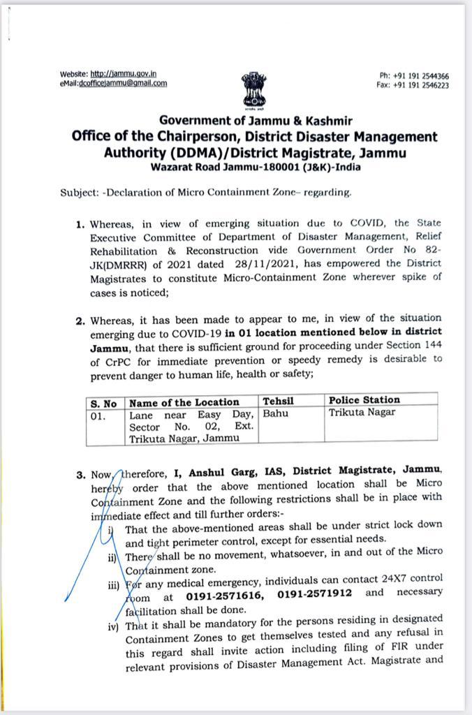 DM Jammu declares Lane near Easy Day Sector No. 02 Ext Trikuta Nagar Micro Containment zones