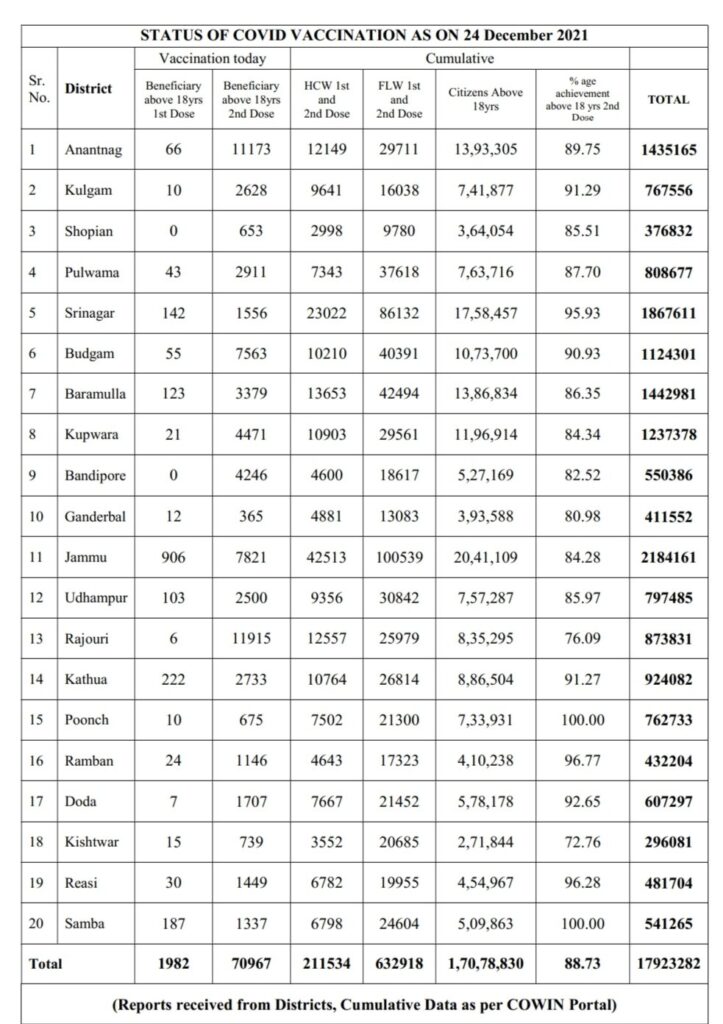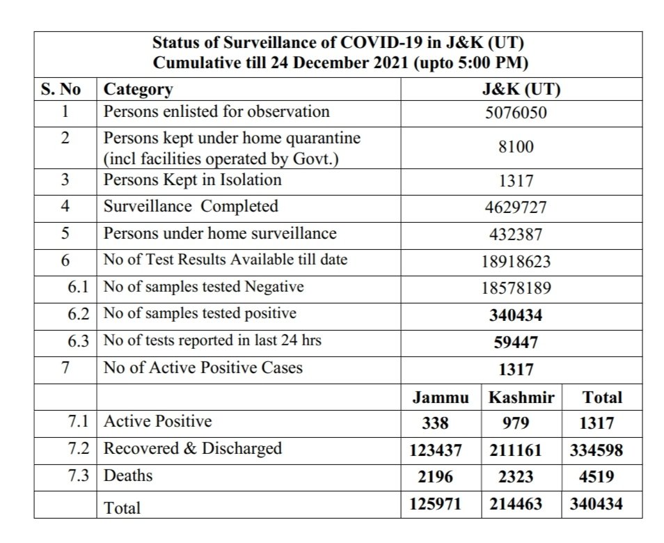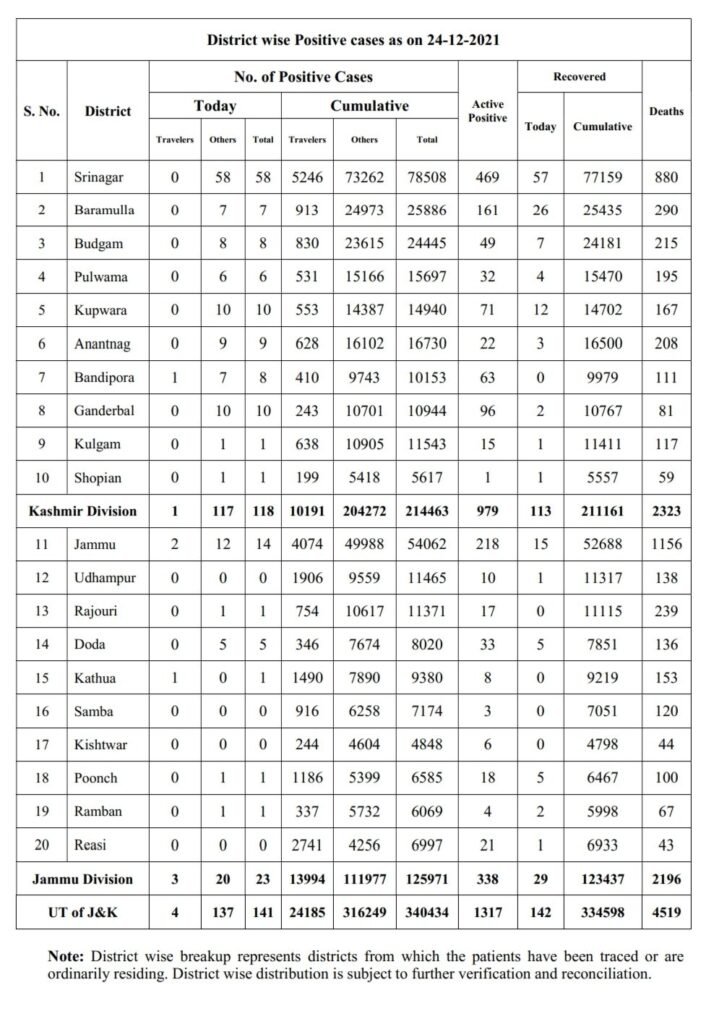 COVID-19 Bulletin December 24 admin December 24, 2021 141 new positive cases reported; 23 from Jammu Division and 118 from Kashmir Division; 01 Covid deaths has been reported from Kashmir Division Latest News Top J&K News