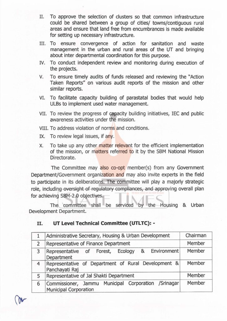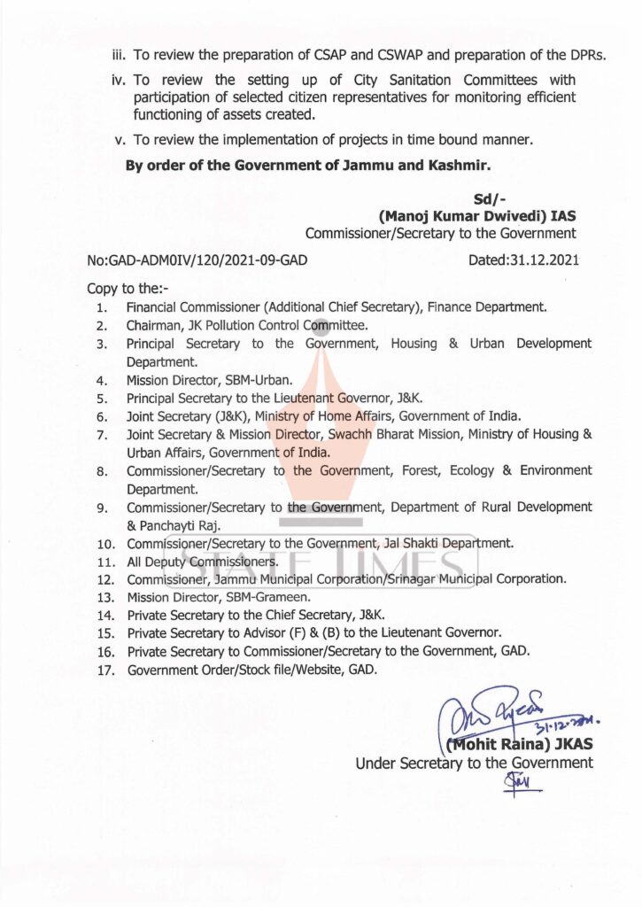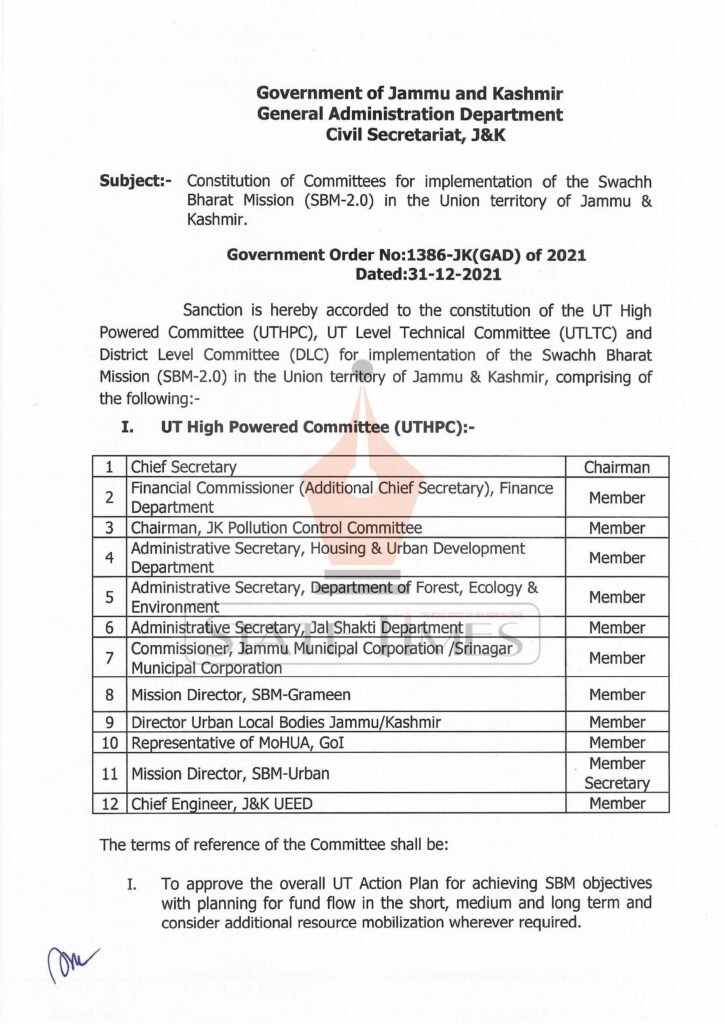 Govt constitutes committees for implementation of Swachh Bharat Mission in J&K admin December 31, 2021 Latest News Top J&K News