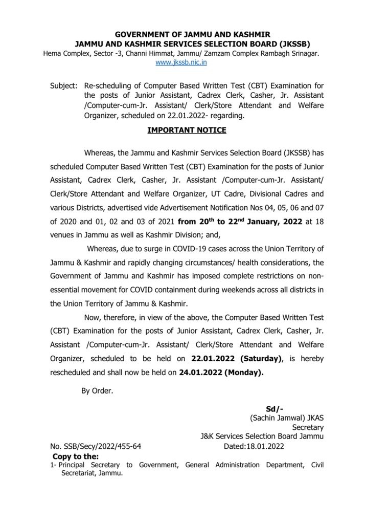 JAMMU: ‘Computer Based Written Test (CBT) Examination to be conducted by Jammu and Kashmir Service Selection Board (J&K SSB) for the posts of Junior Assistant, Cadrex Clerk, Casher, Jr. Assistant /Computer-cum-Jr. Assistant/ Clerk/Store Attendant and Welfare Organizer, scheduled to be held on 22.01.2022 (Saturday), is hereby rescheduled and shall now be held on 24.01.2022 (Monday).