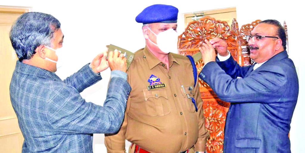 JAMMU: In a piping ceremony held at Police Headquarters here on Friday, the Director General of Police (DGP) J&K Dilbag Singh accompanied by ADGP Headquarters, PHQ M.K Sinha decorated SP rank to Jagbir Singh who has been recently promoted to the present rank.