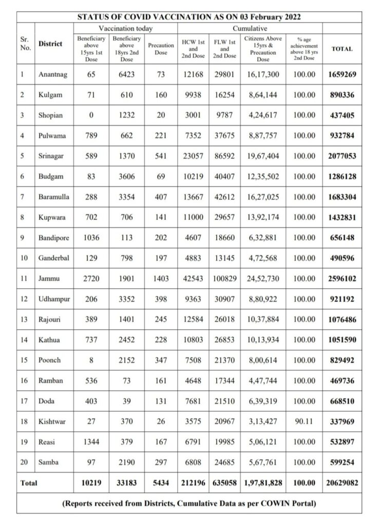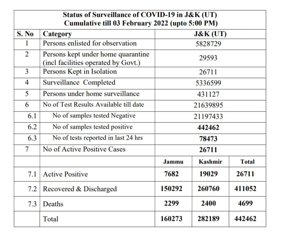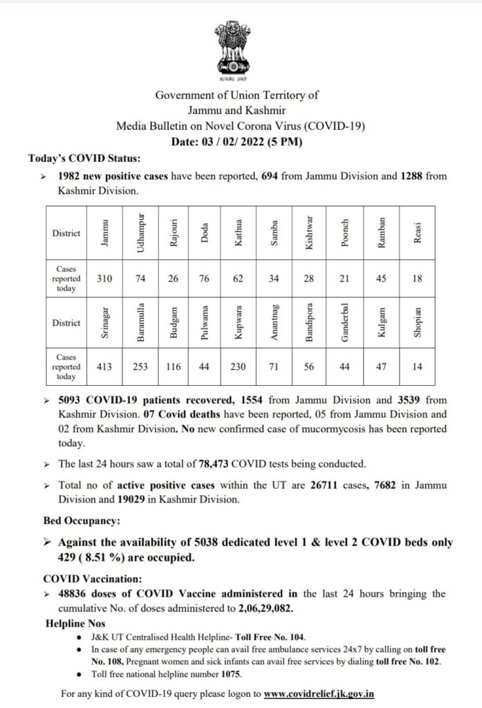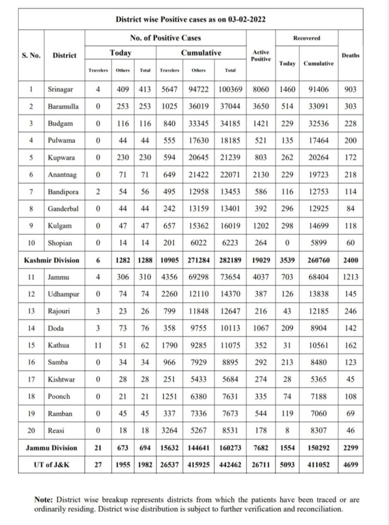 Of the fresh Covid cases, 694 were reported from the Jammu division and 1,288 from the Kashmir division, the officials said, adding the overall tally of cases has climbed to 4,42,462.