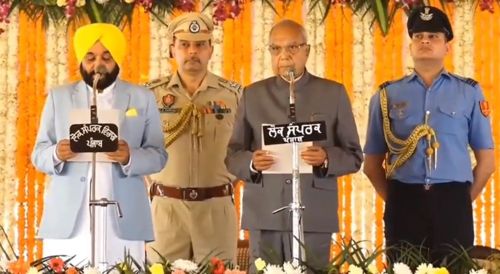 Punjab Governor Banwarilal Purohit administered the oath of office and secrecy to Mann in the swearing-in ceremony that took place at Khatkar Kalan, the ancestral village of legendary freedom fighter Bhagat Singh in Punjab’s Shaheed Bhagat Singh (SBS) Nagar district.