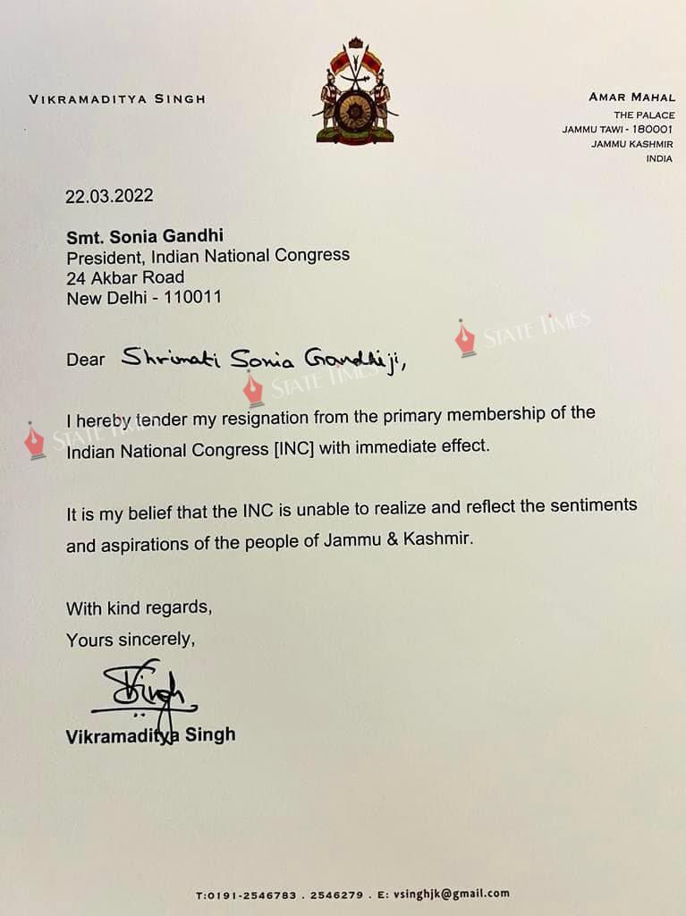 Former MLC Vikramaditya Singh resigns from Congress admin March 22, 2022 Image Gallery Jammu Latest News Top J&K News Twitter