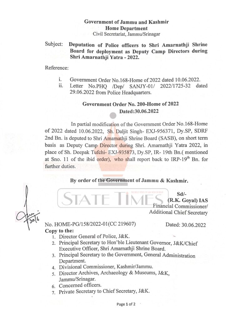 Deputation of Police officers to Shri Amarnathji Shrine Board for deployment as Deputy Camp Directors during Shri Amarnathji Yatra-2022.