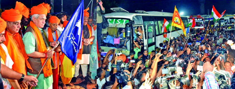 Flanked by political leaders and officials, Mayor Jammu Municipal Corporation, Chander Mohan Gupta; Chief Secretary, Dr. Arun Kumar Mehta ADGP Jammu, Mukesh Singh; Divisional Commissioner Jammu, Ramesh Kumar; DC Jammu, Avny Lavasa; Commissioner JMC, Rahul Yadav, besides BJP leader Devender Rana, the LG flagged off the convoy of buses and other vehicles carrying pilgrims on their inward journey to the twin base camps in Kashmir.