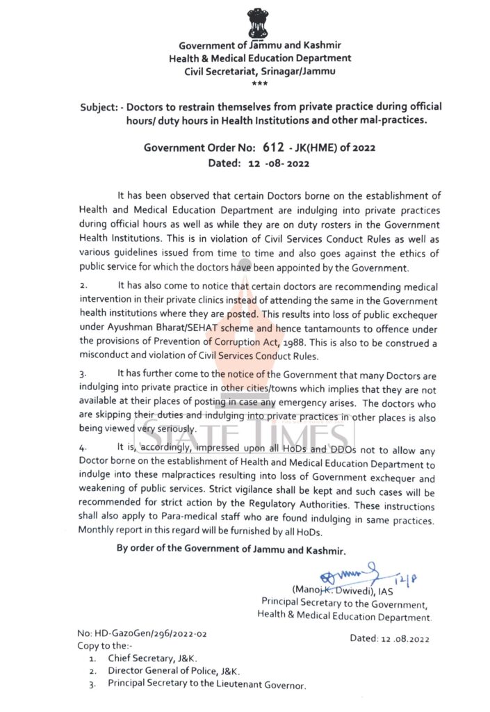 J&K Govt orders doctors to restrain themselves from private practice during duty hours in Health Institutions and other mal-practices admin August 12, 2022 Jammu Latest News Top JandK News