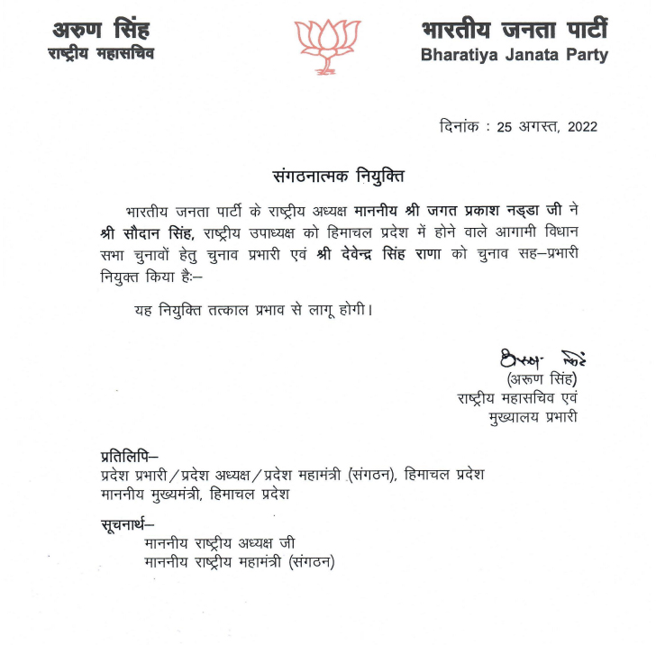 Saudan Singh appointed as Chief election in-charge and Devender Singh Rana appointed as election co-in charge for the upcoming polls in Himachal Pradesh