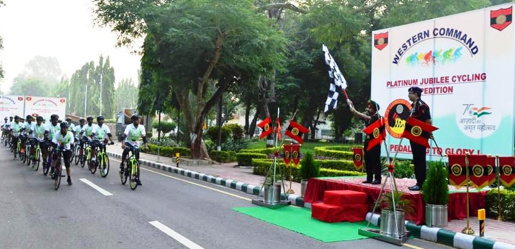 A 26 member team of Western Command set off on a cycling expedition on the route Chandimandir – Jalandhar – Pathankot – Yol Cantt – Mamun – Jammu – Amritsar – Ferozpur – Ludhiana – Patiala – Kunjpura – New Delhi – Meerut – Ambala and back to Chandimandir on 13 Sep 2022 to commemorate the Platinum Jubilee of Western Command and Azadi Ka Amrit Mahotsav. The expedition was flagged off by Maj Gen GS Kahlon, Officiating Chief of Staff, Western Command.