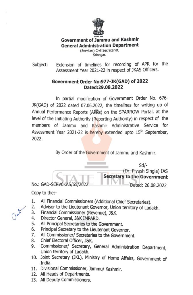 In partial modification of Government Order No. 676- JK(GAD) of 2022 dated 07.06.2022, the timelines for writing up of Annual Performance Reports (APRS) on the SPARROW Portal, at the level of the Initiating Authority (Reporting Authority) in respect of the members of Jammu and Kashmir Administrative Service for Assessment Year 2021-22 is hereby extended upto 15th September, 2022. By Order of the Government of Jammu and Kashmir.