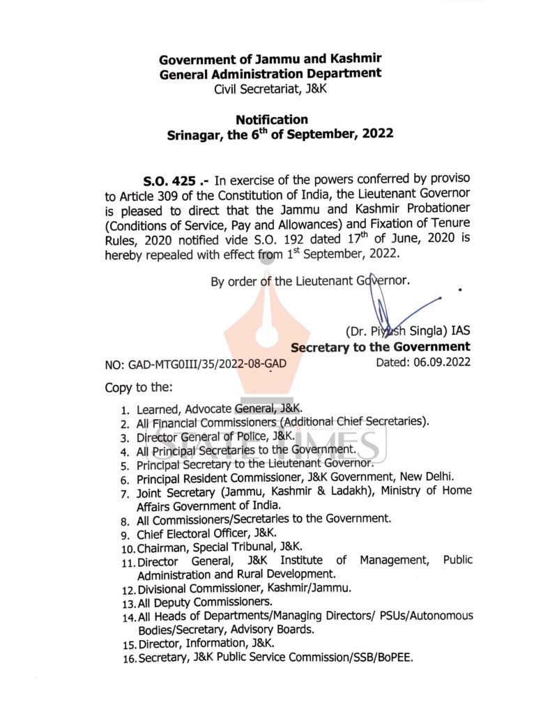 S.O. 425.- In exercise of the powers conferred by proviso to Article 309 of the Constitution of India, the Lieutenant Governor is pleased to direct that the Jammu and Kashmir Probationer (Conditions of Service, Pay and Allowances) and Fixation of Tenure Rules, 2020 notified vide S.O. 192 dated 17th of June, 2020 is hereby repealed with effect from 1st September, 2022. By order of the Lieutenant Governor.