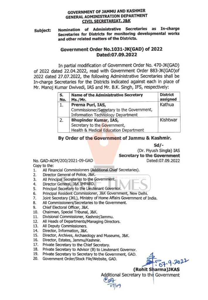 Prerna Puri, Bhupinder Kumar nominated as In-charge Secretaries for Districts for monitoring developmental works and other related matters of the Districts