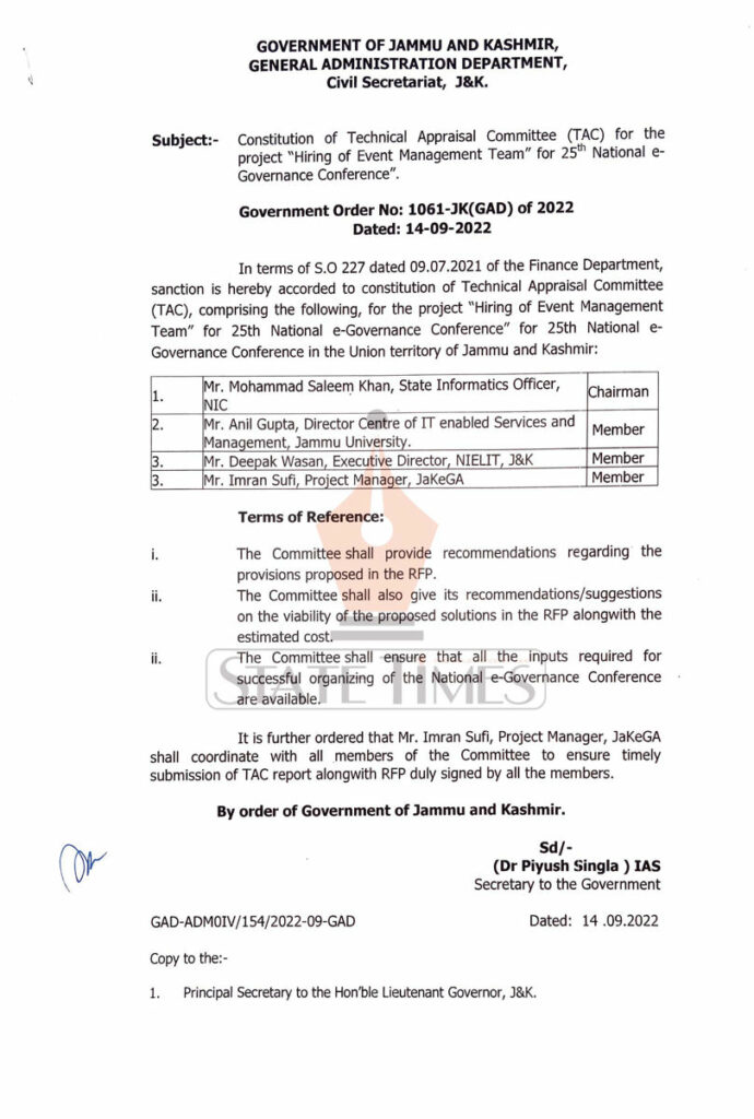J&K Govt constitutes TAC for project “Hiring of Event Management Team for 25th National e-Governance Conference” admin September 14, 2022 Latest News Top JandK News