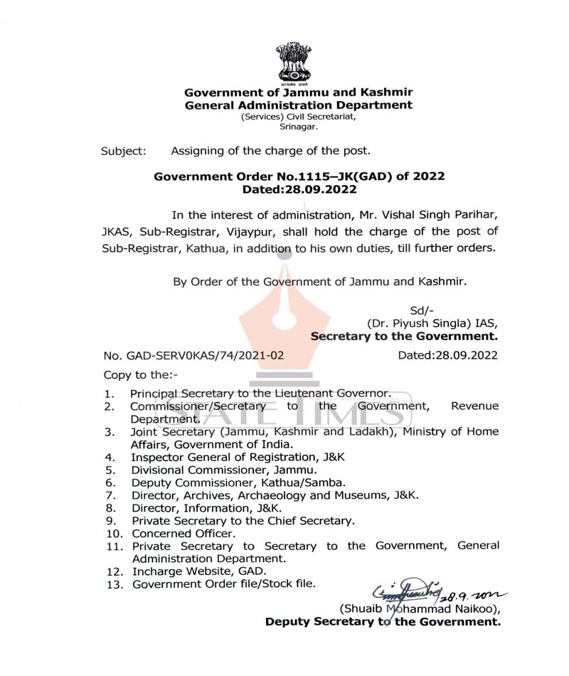 Three JKAS officers transferred, one gets addl charge admin September 28, 2022 Jammu Latest News Top JandK News