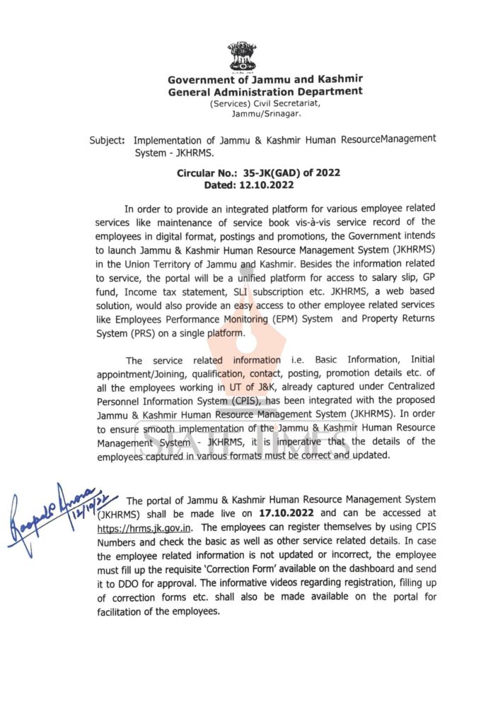 The portal of Jammu & Kashmir Human Resource Management System JKHRMS) shall be made live on 17.10.2022 and can be accessed at https://hrms.ik.gov.in. The employees can register themselves by using CPIS Numbers and check the basic as well as other service related details. In case the employee related information is not updated or incorrect, the employee must fill up the requisite Correction Form’ available on the dashboard and send it to DDO for approval. The informative videos regarding registration, filing up of correction forms etc. shall also be made available on the portal for facilitation of the employees.