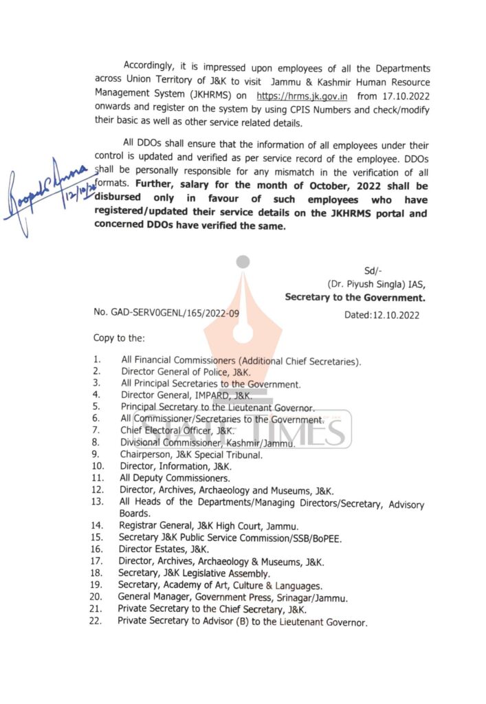 All DDOs shall ensure that the information of all employees under their control is updated and verified as per service record of the employee. DDOs shall be personally responsible for any mismatch in the verification of all formats. Further, salary for the month of October, 2022 shall be disbursed only in favour of such employees who have registered/updated their service details on the JKHRMS portal and concerned DDOs have verified the same.