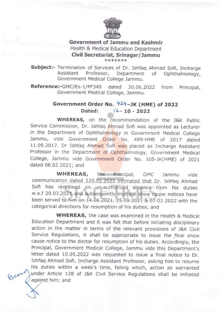 Unauthorised Absence: Asstt Proff Dr. Ishfaq Ahmad Sofi, Department of Ophthalmology, GMC Jammu terminated from service admin October 12, 2022 Jammu Latest News Top JandK News