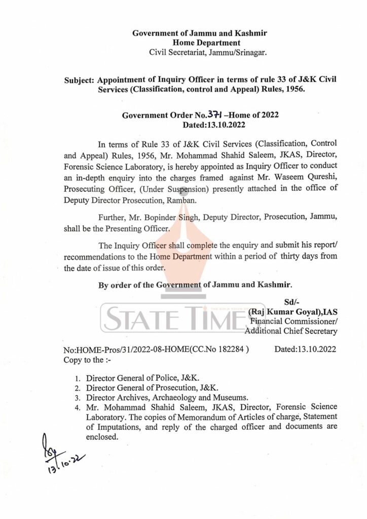 Director FSL Mohd Shahid Saleem appointed as Inquiry Officer into charges framed against Wasim Qureshi Prosecuting Officer