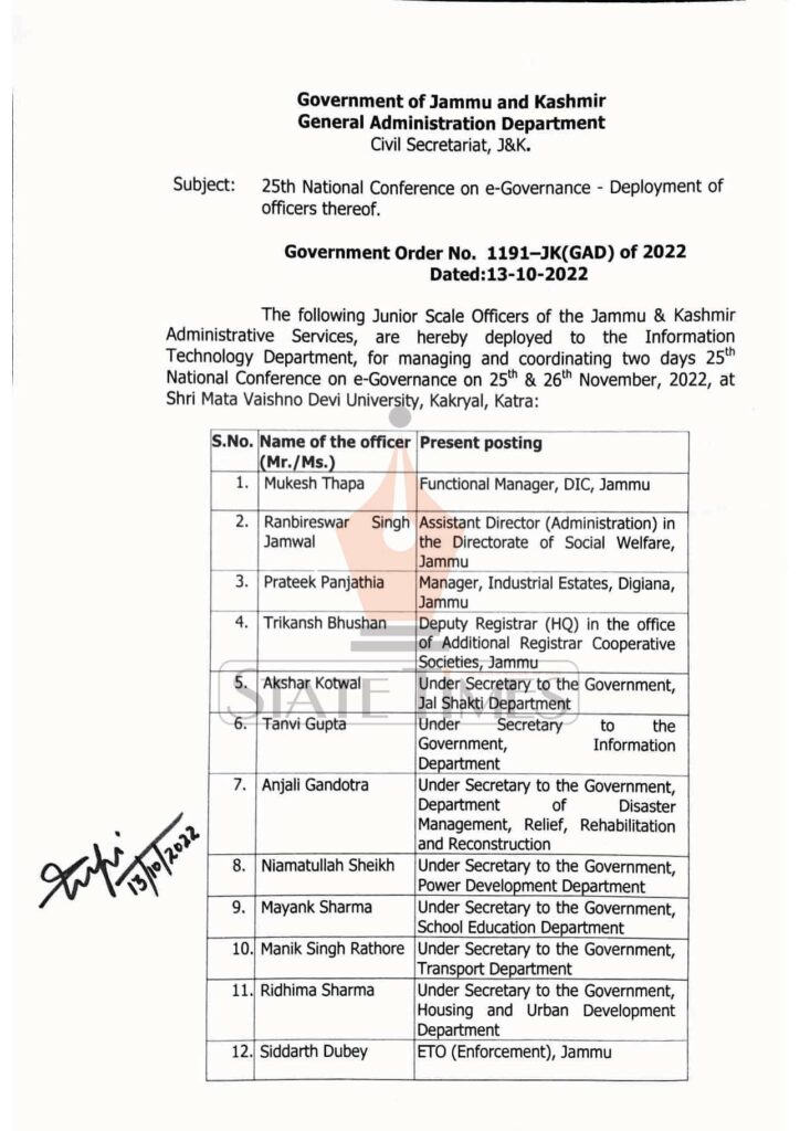 Govt deploys officers for Two days 25th National Conference on e-Governance admin October 13, 2022 Latest News Top JandK News