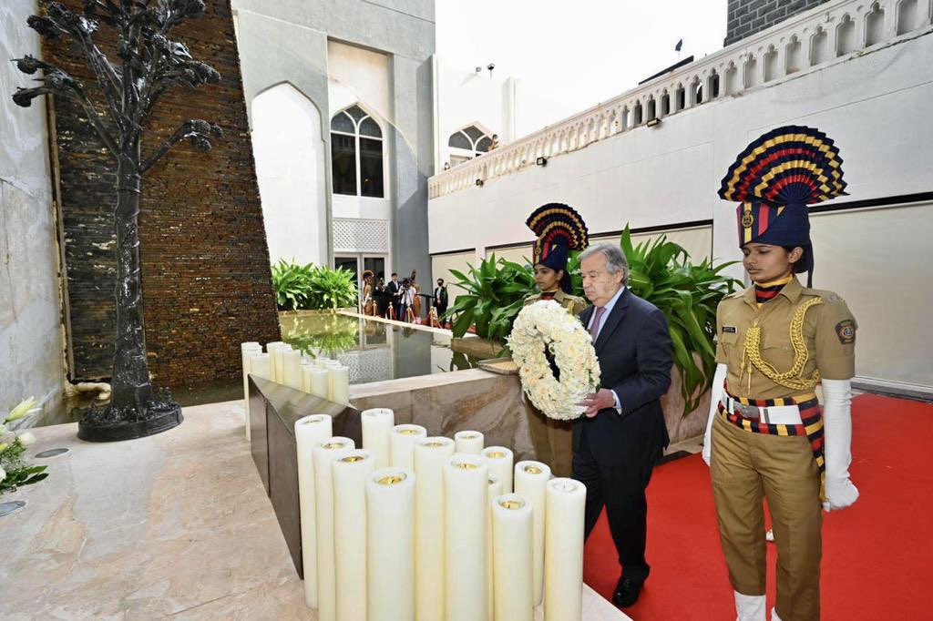 Accompanied by Maharashtra Chief Minister Eknath Shinde and Deputy CM Devendra Fadnavis, Guterres placed a floral wreath at the 26/11 attacks memorial in the hotel.