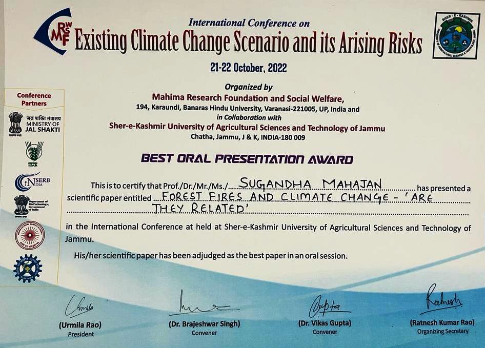 A Ph.D Scholar working under the guidance of Dr. Harish Chander Dutt, Senior Assistant Professor, Department of Botany, University of Jammu, the award winning Sugandha Mahajan’s presentation was on topic “Forest fires and Climate change- Are they related”.
