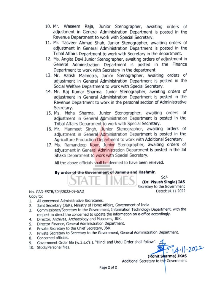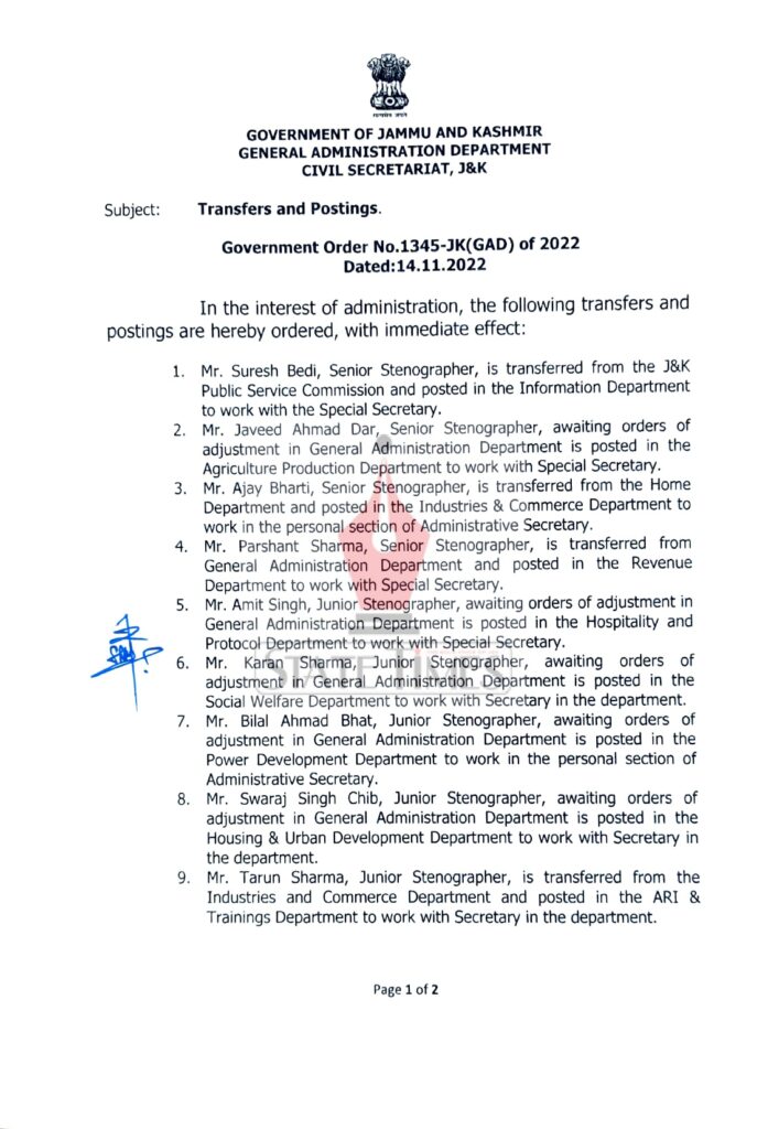 J&K Govt orders transfers and postings of Stenographers