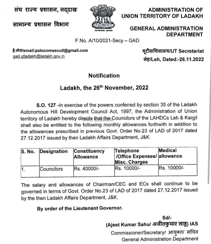 Councillors of the LAHDCs of Leh & Kargil shall be getting additional monthly Constituency Allowance at ₹40,000/-, Office/Telephone Allowance at ₹10,000/- and Medical Allowance of ₹10,000/-. So far they were getting ₹60,000/- only as salary.