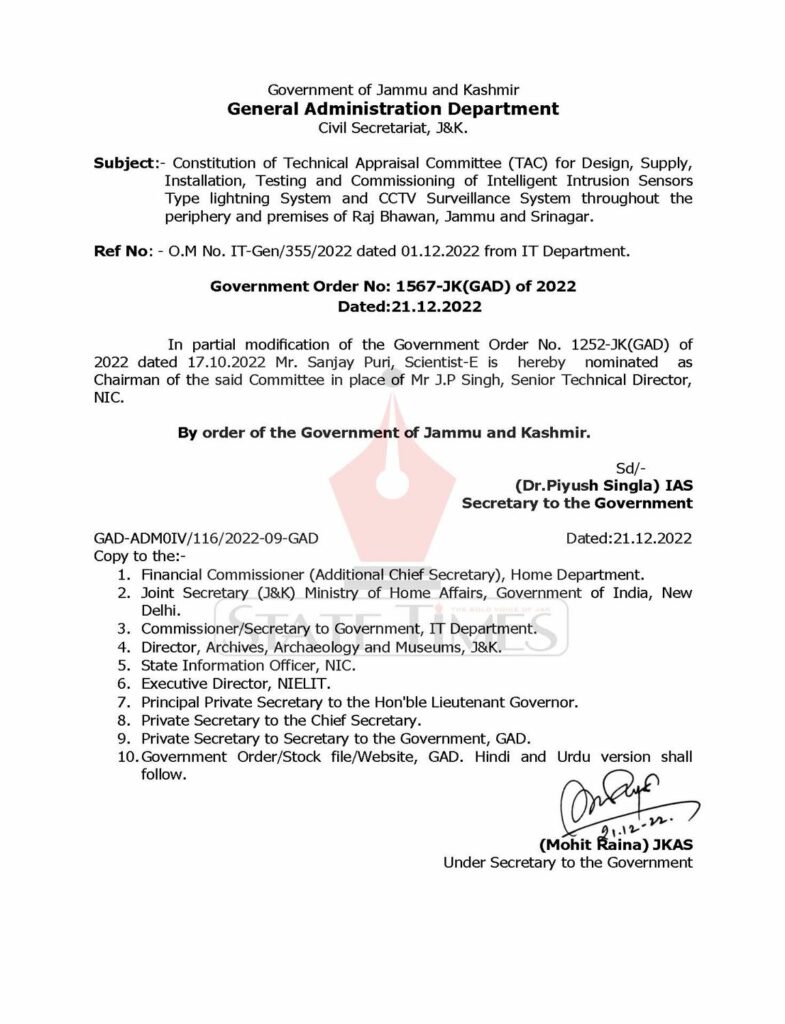 Constitution of Technical Appraisal Committee TAC for Design Supply Installation Testing and Commissioning of Intelligent Intrusion Sensors Type lightning System and CCTV Surveillance System throughout the periphery and premises of Raj Bhawan Jammu and Srinagar