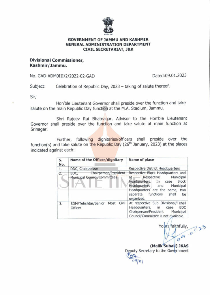 “Further, DDC, Chairperson shall preside over the functions at respective district headquarters and take salute on the Republic Day (26th January, 2023).”