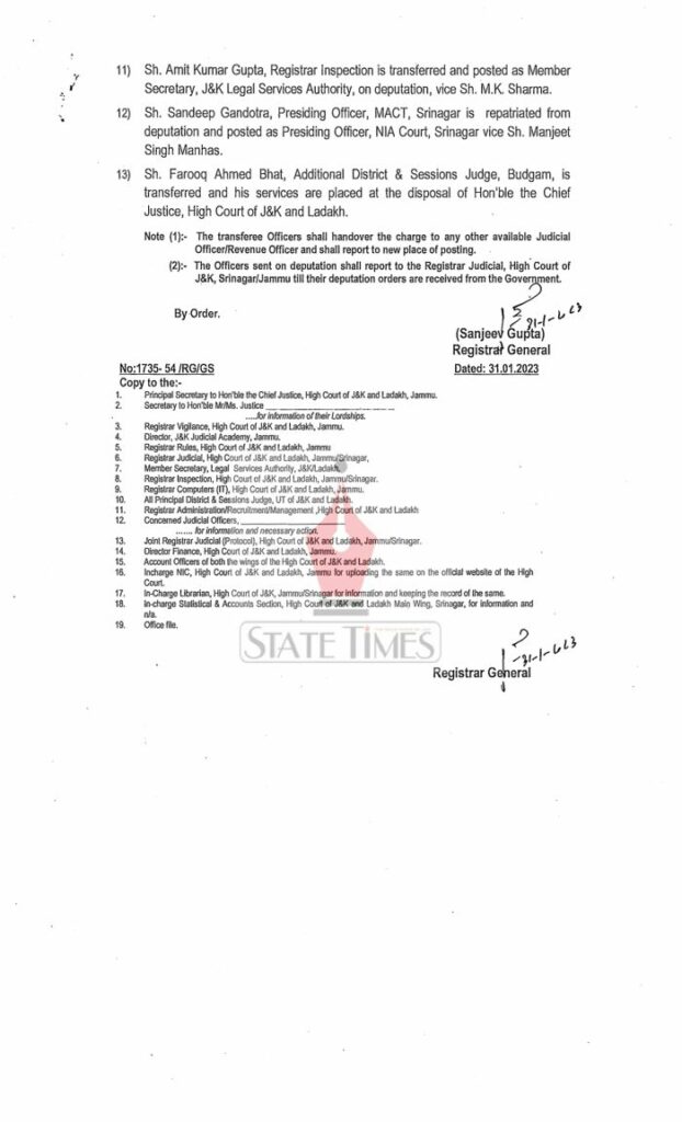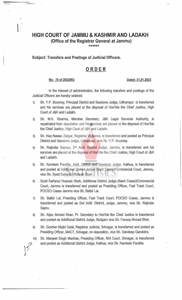 Transfers and Postings of Officers in Judiciary admin January 31, 2023 Courts Image Gallery Jammu Latest News Top JandK News Twitter