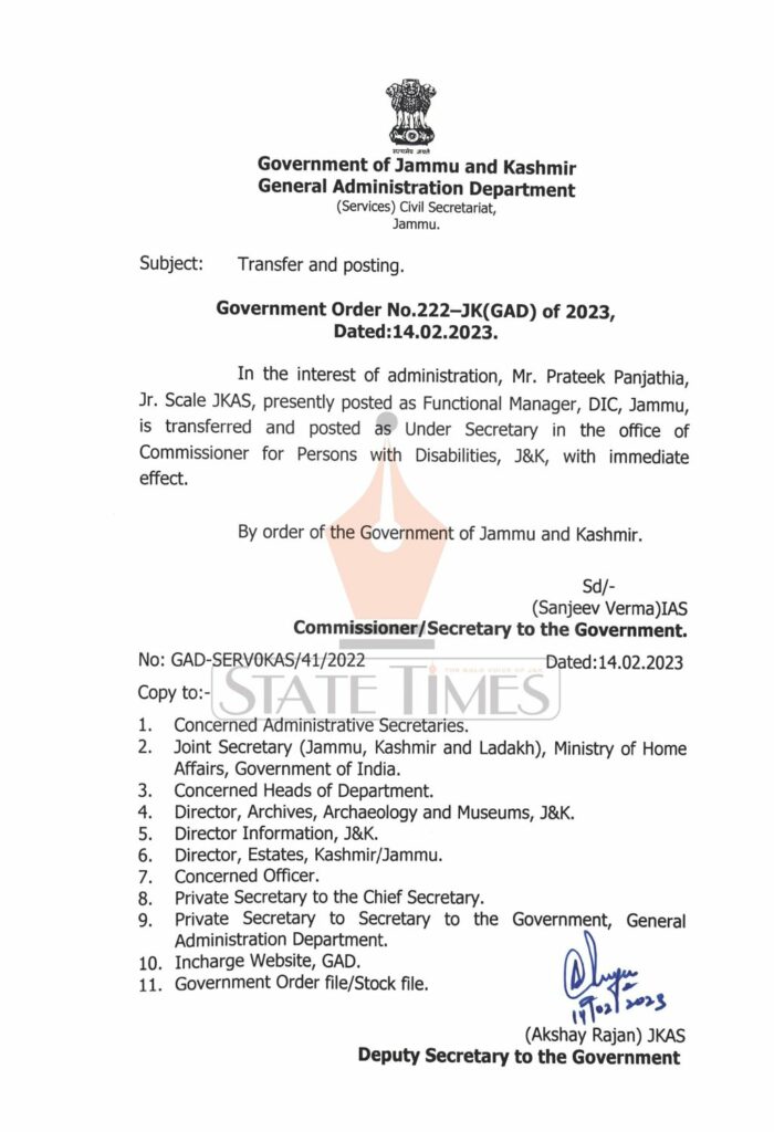 In the interest of administration, Prateek Panjathia, Jr. Scale JKAS, presently posted as Functional Manager, DIC, Jammu, is transferred and posted as Under Secretary in the office of Commissioner for Persons with Disabilities, J&K, with immediate effect, read order below: