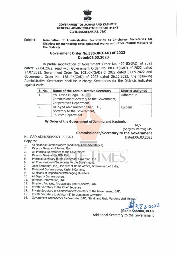 “In partial modification of Government Order No. 470-JK(GAD) of 2022 dated: April 22, 2022, read with Government Order No. 883-JK(GAD) of 2022 dated July 27, 2022, Government Order No. 1031-JK(GAD) of 2022 dated September 7, 2022 and Government Order No. 1581-JK(GAD) of 2022 dated December 26, 2022, the two Administrative Secretaries shall be in-charge Secretaries for the Districts,” reads an order issued by Sanjeev Verma, Commissioner/Secretary, General Administration Department.