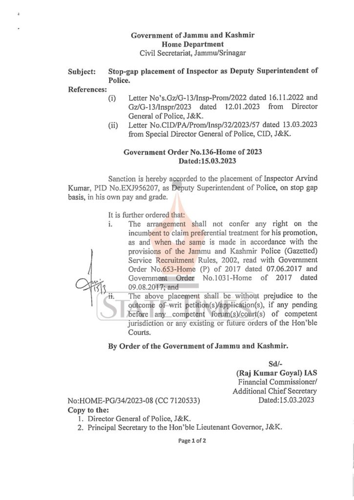 Sanction is hereby accorded to the placement of Inspector Arvind Kumar, PID No.EXJ956207, as Deputy Superintendent of Police, on stop gap basis, in his own pay and grade, read order below: