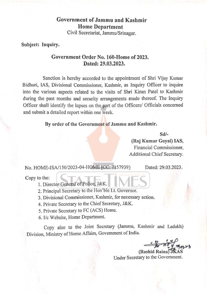 According to an order issued by the Home Department, Divisional Commissioner, Kashmir, V K Bhiduri has been appointed as the inquiry officer and directed to submit a detailed report within one week.