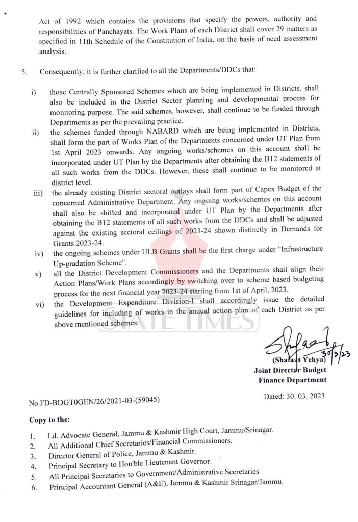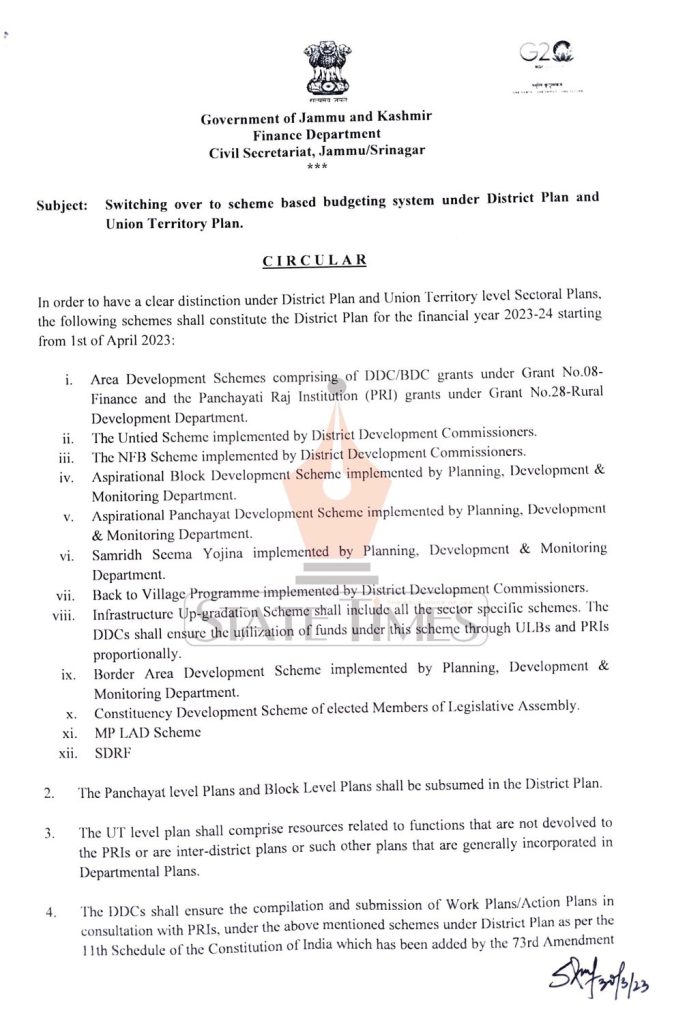 In order to have a clear distinction under District Plan and Union Territory level Sectoral Plans. the following schemes shall constitute the District Plan for the financial year 2023-24 starting from 1st of April 2023, read circular below: