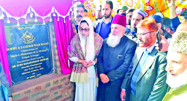 SRINAGAR: Chairperson J&K Waqf Board, Dr Darakhshan Andrabi on Wednesday announced the Waqf Board decision of naming the historic Eidgah at Srinagar on the name of Shah-e-Hamadan (RA) and laid the foundation stone for the new state of art Minber being constructed by Waqf Board.