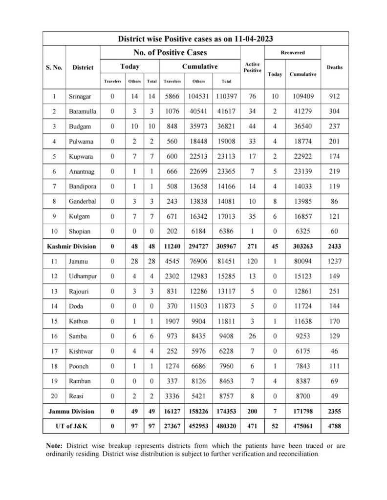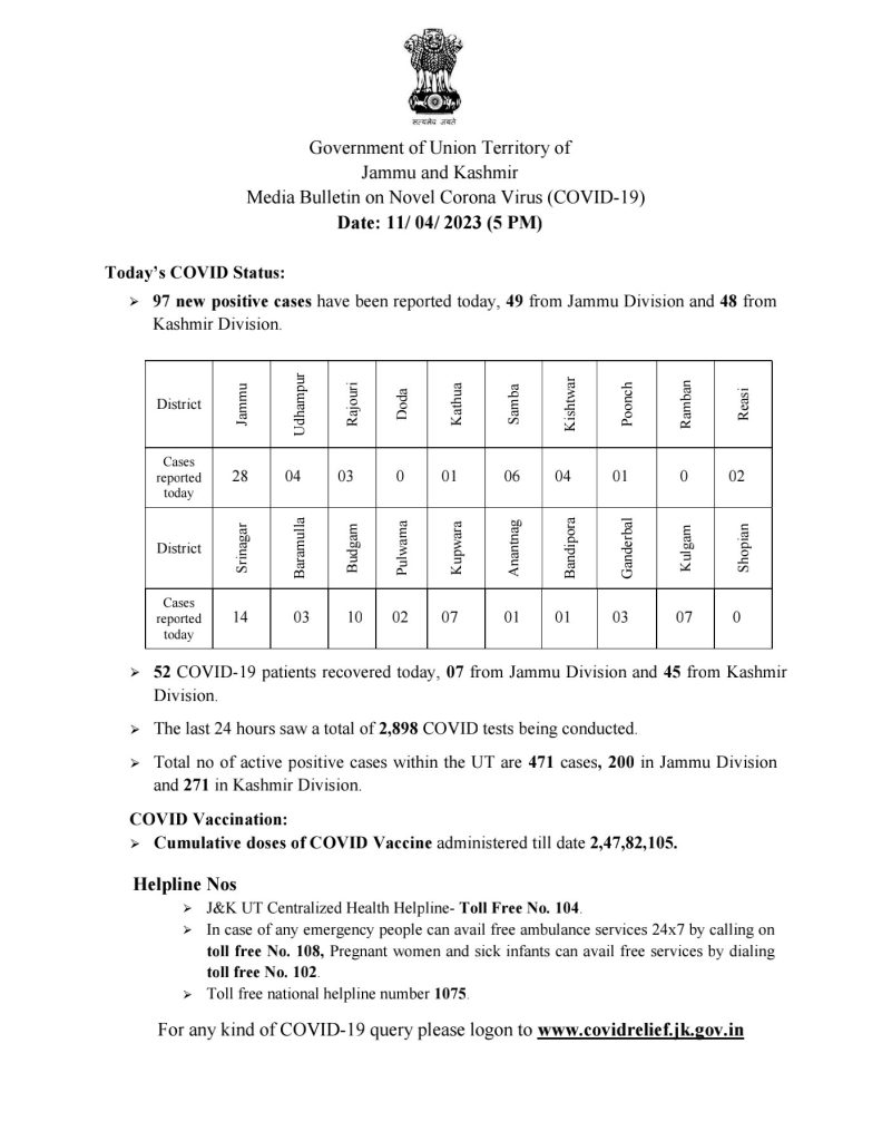J&K: COVID-19 Bulletin April 11 admin April 11, 2023 STATE TIMES NEWS COVID-19 Bulletin April 11 97 new positive cases reported 49 from Jammu Division and 48 from Kashmir Division Latest News Top J&K News