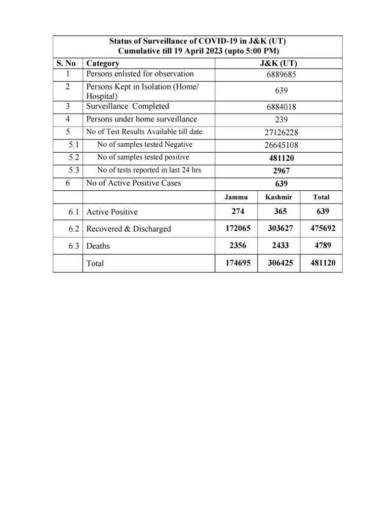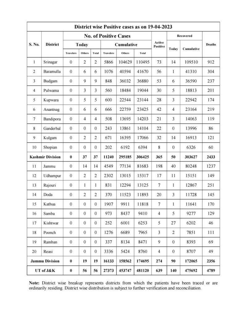 J&K: COVID-19 Bulletin April 19 admin April 19, 2023 STATE TIMES NEWS COVID-19 Bulletin April 19 56 new positive cases reported 19 from Jammu Division and 37 from Kashmir Division Jammu Kashmir Latest News Top J&K News
