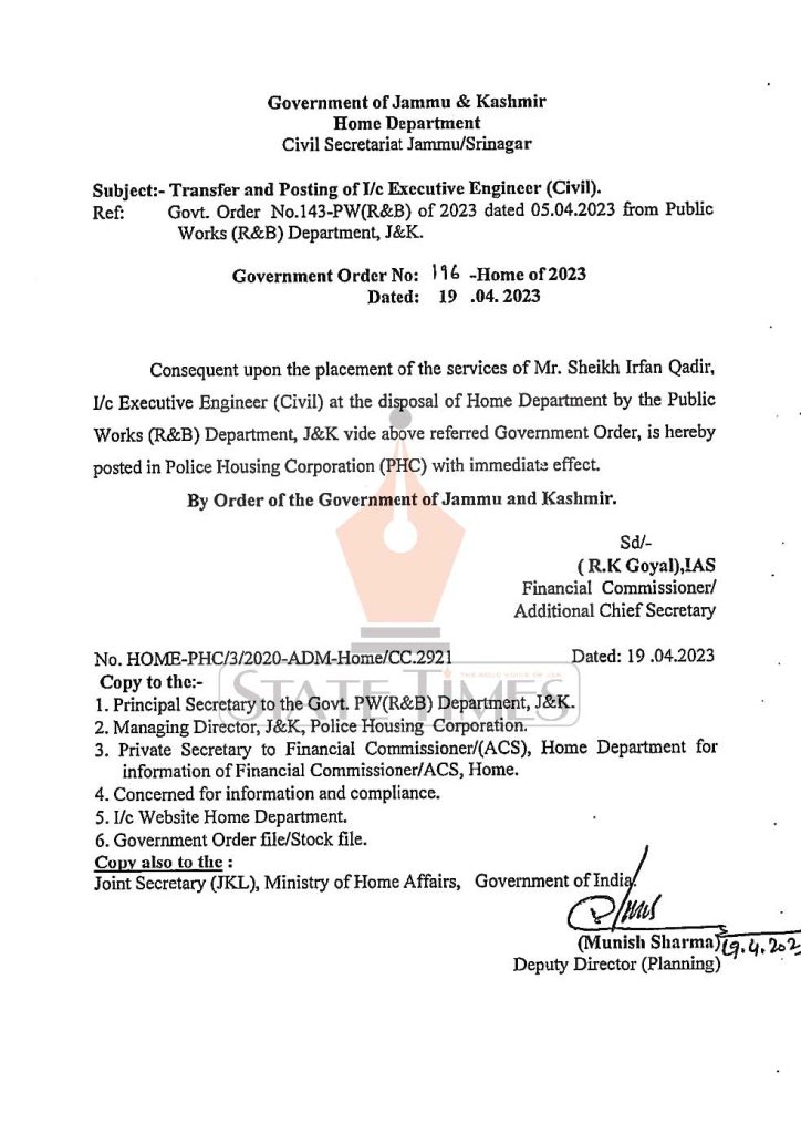 Consequent upon the placement of the services of Sheikh Irfan Qadir, I/c Executive Engineer (Civil) at the disposal of Home Department by the Public Works (R&B) Department, J&K vide above referred Government Order, is hereby posted in Police Housing Corporation (PHC) with immediate effect, read order below: