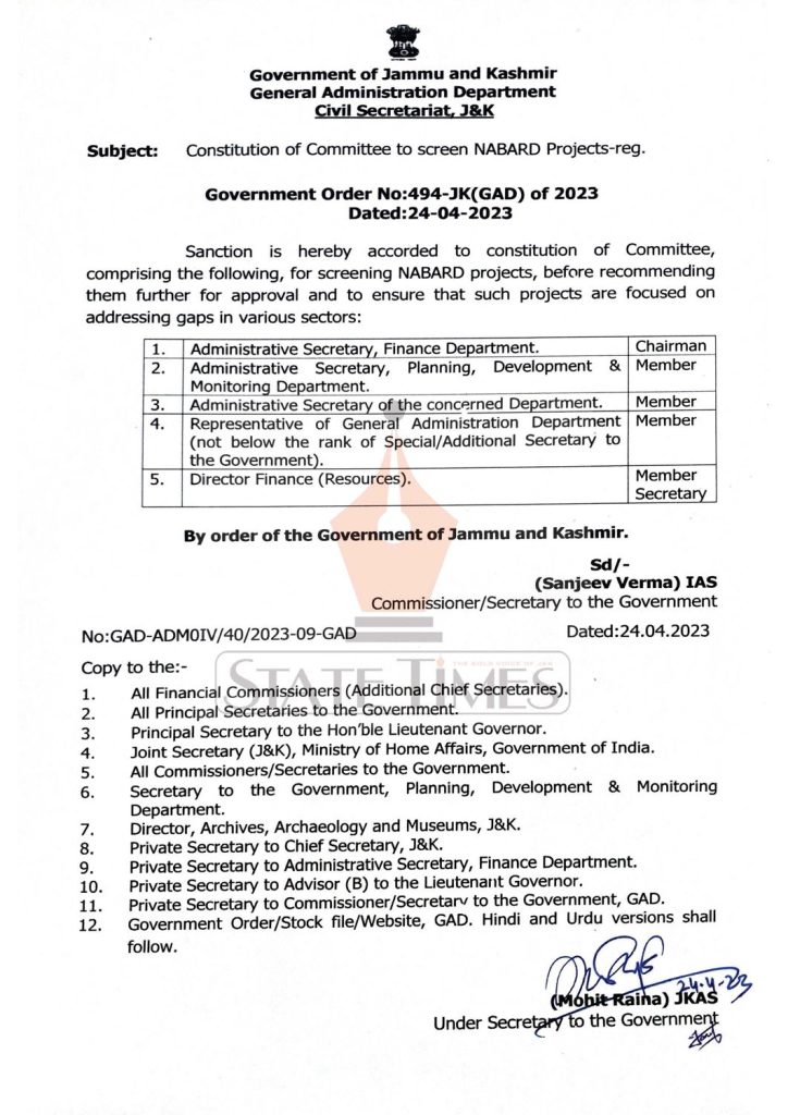 Sanction is hereby accorded to constitution of Committee, comprising the following, for screening NABARD projects, before recommending them further for approval and to ensure that such projects are focused on addressing gaps in various sectors, read order below: