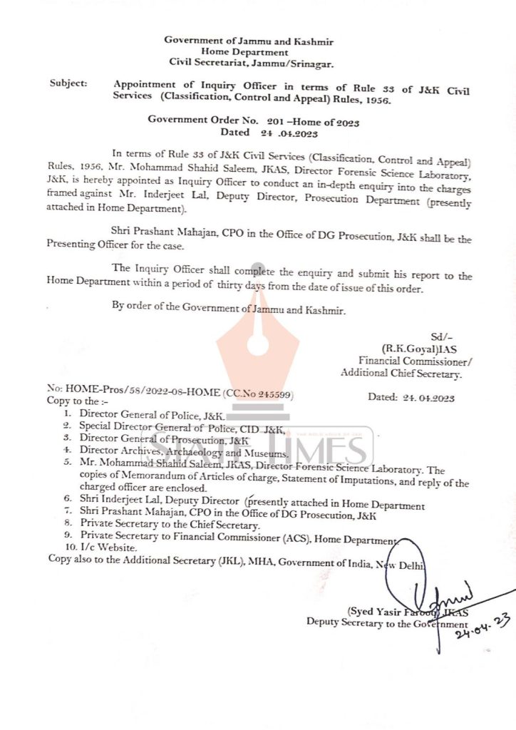 “In terms of Rule 33 of J&K Civil Services (Classification, Control and Appeal] Rules, 1956, Mohammad Shahid Saleem, JKAS, Director Forensic Science Laboratory, J&K is appointed as Inquiry Officer to conduct an in-depth enquiry into the charges framed against Inderjeet Lal, Deputy Director, Prosecution Department (presently attached in Home Department),” reads an order issued by Raj Kumar Goyal, Financial Commissioner/Additional Chief Secretary, Home Department J&K.
