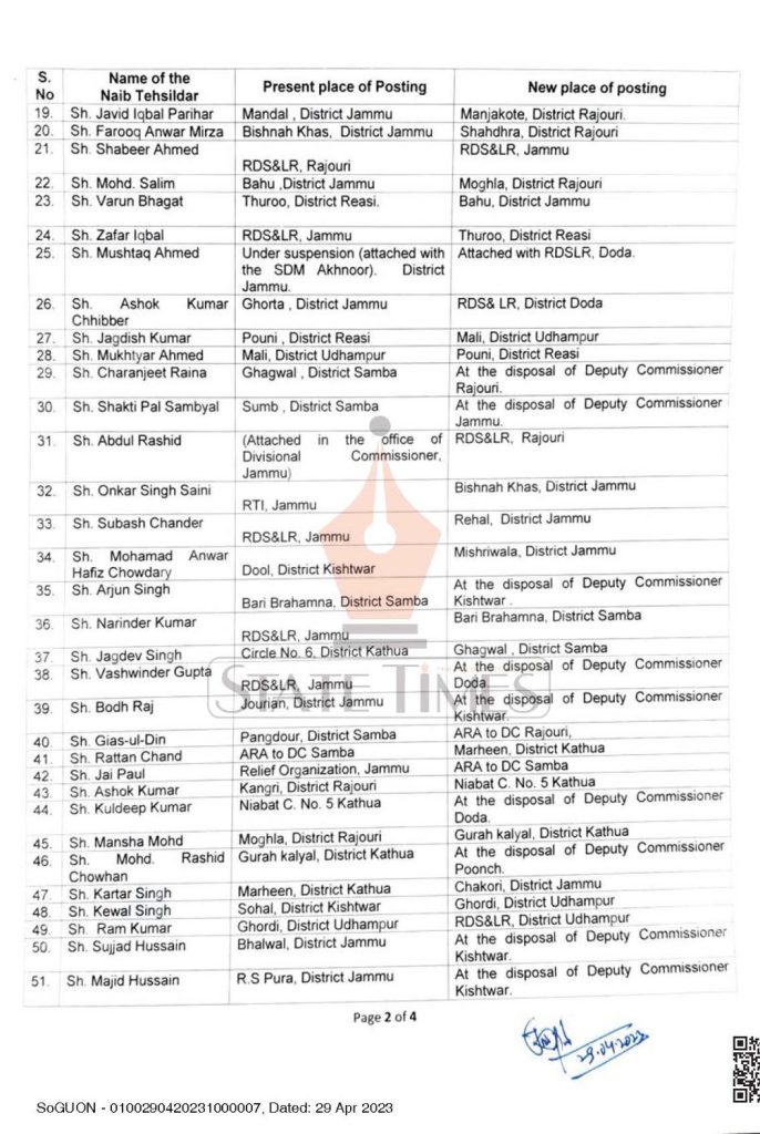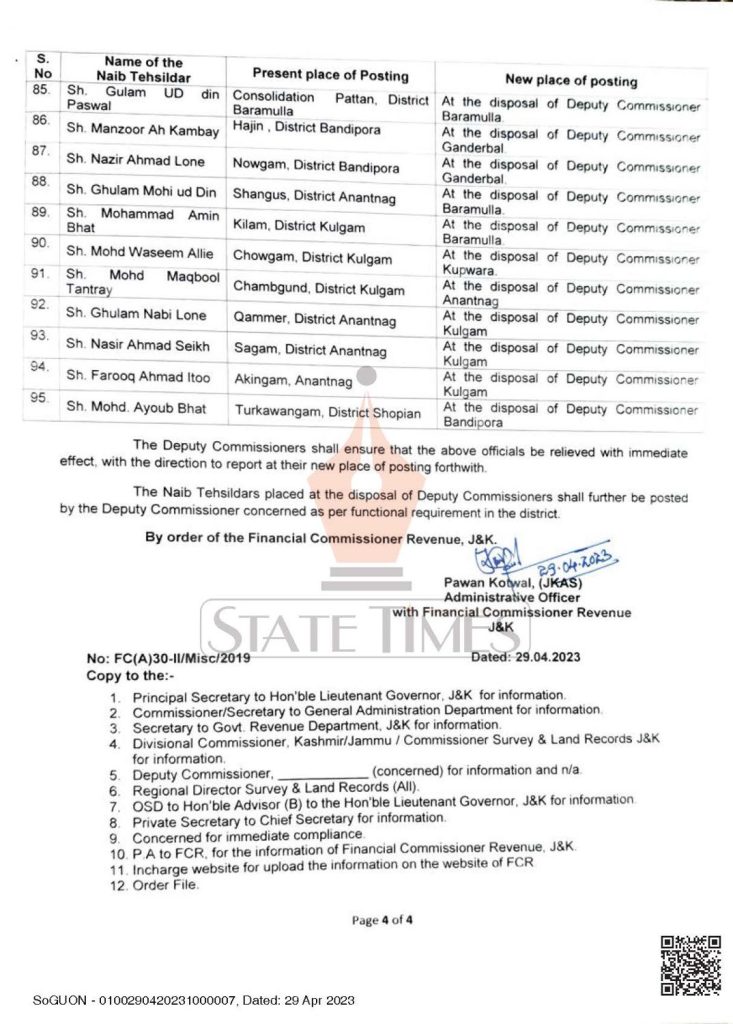 The Naib Tehsildars placed at the disposal of Deputy Commissioners shall further be posted by the Deputy Commissioner concerned as per functional requirement in the district, read order below.