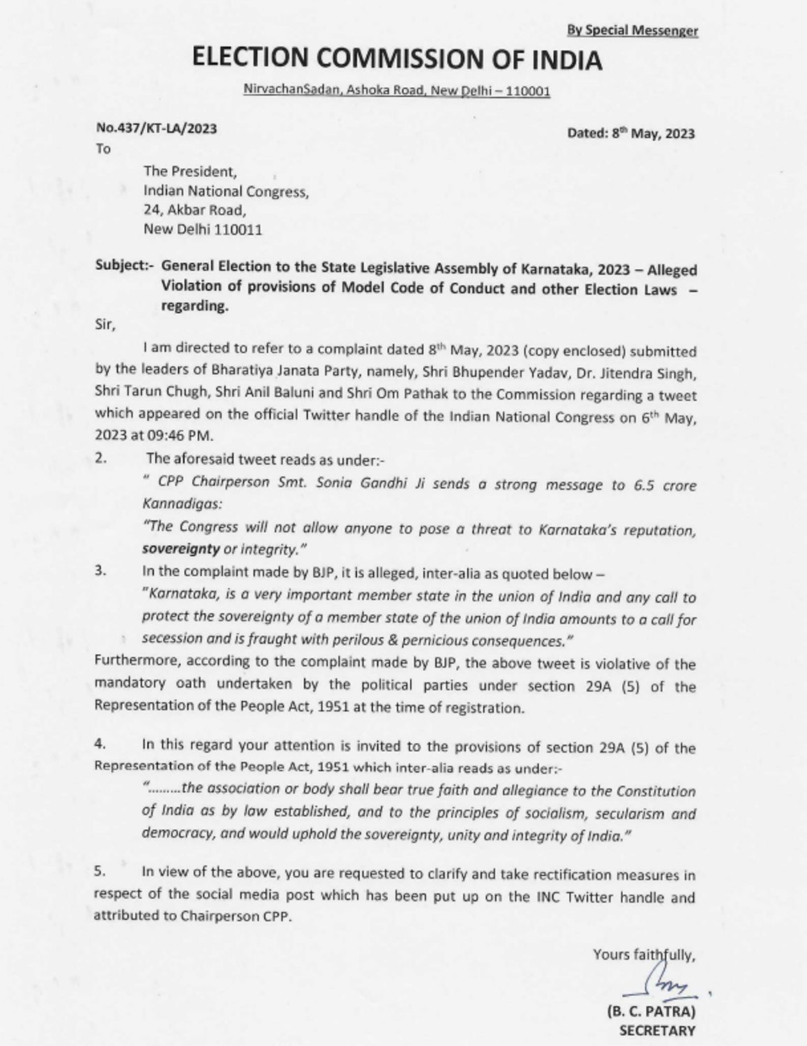 The Commission received a complaint dated 8th May, 2023 submitted by the leaders of BJP, Bhupender Yadav, Dr. Jitendra Singh, Tarun Chugh, Anil Baluni and Om Pathak. According to the complaint made by BJP, the above tweet is violative of the mandatory oath undertaken by the political parties under section 29A (5) of the Representation of the People Act, 1951 at the time of registration: Election Commission